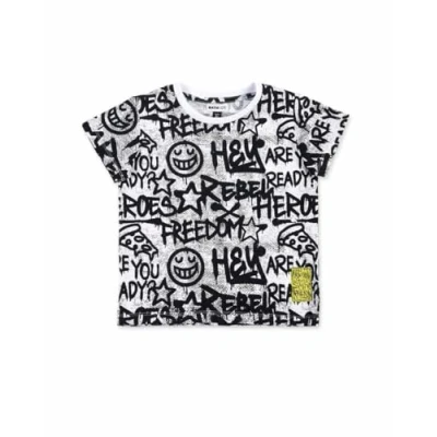 White jersey t-shirt with black graffiti print for boys. Urban Attitude Collection Machine washable at max. 30°C short spin, do not bleach, do not bleach, do not tumble dry, air dry, iron at 110ºC max, do not dry clean