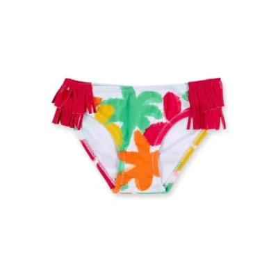 White bib with palm tree print and fringe on the sides for girls. Banana Records Collection.