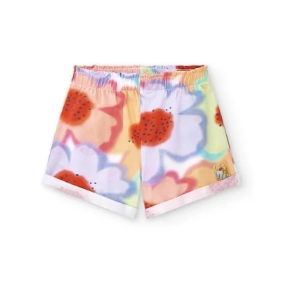 White knitted short with colourful flower print and elastic waist for girls. Paradise Beach Collection
