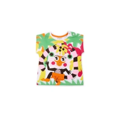 White jersey t-shirt with colorful tropical print for girls. Banana Records Collection. Machine washable at max. 30ºC delicate cycle, do not bleach, do not tumble dry, hang or line dry, iron at 110ºC max, do not dry clean