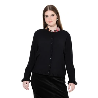 Ulla Popken Women's Cardigan with Ruffle Pullover, black, 54 56