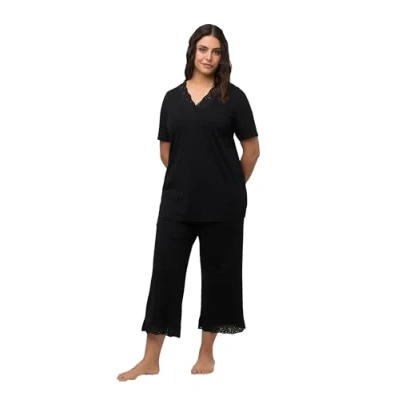 Ulla Popken Women's Pajamas, Broderie, V Neck, Half Sleeve, Modal Mix, Black, 42 44