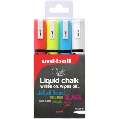 Pack of 4 medium chalk markers with bullet tip in white Easily removes from non-porous surfaces such as blackboards or glass with a damp cloth Perfect for home use or signs of pubs, cafes and restaurants The chalk pen is rainproof - so your message remains readable outside Medium width tip, produces a 1.8-2.5mm line
