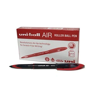 Freedom of a fountain pen with the security of a roller-ball with no leaks, the Air’s unique metal ball can move without friction when the pen is held at an angle Filled with Uni-Ball Super Ink, an advanced ink formula that bonds to paper fibers, fade resistant, water resistant, and acid free, resistant to chemicals that wash dye-based ink from checks Light pressure will give a finer line as ink is transferred by the ball itself, firmer pressure allows the ink to flow freely around the ball for a thicker line Will give you a finer line width between 0.25mm - 0.45mm, perfect for technical writing or small printing, red ink pens in a box of 12 Sleek, elegant look and feel that is comfortable and easy to grip, capped top stays put and ensures that this pen will never leak in your pocket