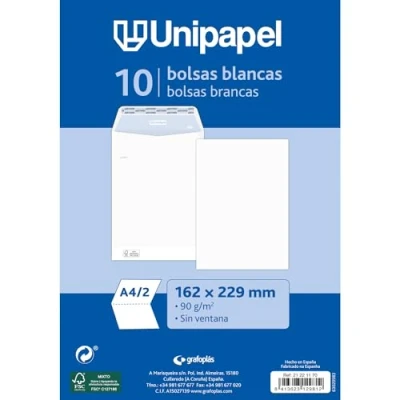PREMIUM QUALITY - This pack contains 10 envelopes made with 100g opaque paper, offering maximum durability and strength to protect your documents SELF ADHESIVE CLOSURE: Each bag has a self-adhesive silicone strip with autodesk system, which ensures that your shipments arrive intact at their destination. Its opening is easy, but tamper-proof CHOOSE YOUR SIZE - Unipapel bags feature sizes for each type of document. This 162x229mm package is perfect for a4 documents folded in half and unfolded a5 documents Friends of the Environment: Made in Spain with FSC certified materials, these shipping envelopes are an eco-friendly option that contributes to responsible forest management. PERFECT FOR OFFICES: These envelope bags are perfect for sending or transferring all types of office documents such as contracts or invoices in a completely confidential way