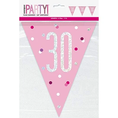 PACKAGE INCLUDES: Pink and silver "30" plastic pennant banner - 9' - 1 Pc. PERFECT FOR BIRTHDAY PARTY: Perfect addition to your birthday decoration spicing up your venue. HIGH QUALITY: A lightweight pennant banner made of plastic which you can use up until your next party. BPA-FREE: These are BPA-free and totally safe to use., Manufacturer: Unique