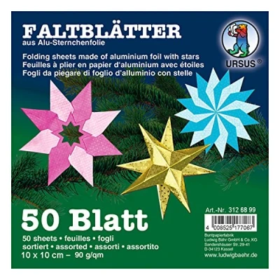 Folding sheets made from aluminium with embossed star Contents: 50 sheets sorted in 10 different colours Dimensions: approx. 10 x 10 cm Paper weight: 90 g/m² Printed on both sides, Manufacturer: Buntpapierfabrik Ludwig Bähr GmbH & Co. KG
