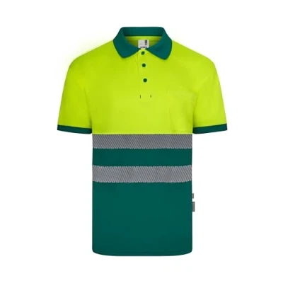 VELILLA 305533; Recycled Polyester Polo Bicolor Short Sleeve Segmented Tape; Green and Fluorescent Yellow; Size L, Yellow, L