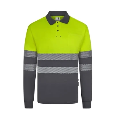 VELILLA 305535; Recycled Polyester Polo Bicolor Long Sleeve Segmented Tape; Color Grey and Fluor Yellow; Size M, Fluorescent Yellow, M