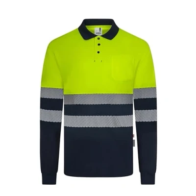 VELILLA 305535; Recycled Polyester Polo Bicolor Long Sleeve Segmented Tape; Navy Blue and Fluorescent Yellow; Size L, Yellow, M, M