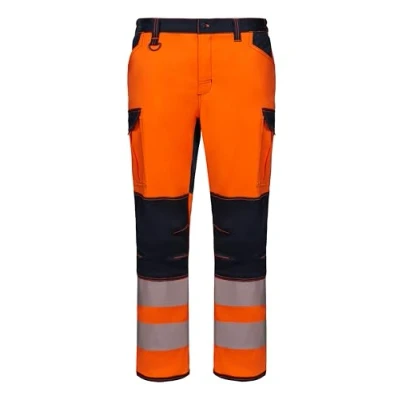 Central zip closure with button and segmented reflective tapes, thermo-fixed, at the bottom of the trousers Elastic side waistband and double safety seams Back fabric reinforcement, on the knees and under the trousers and grippers on the knee Knee with compartment for the knee, with lower access and Velcro closure and eight pockets Plastic ring on one of the waist loops