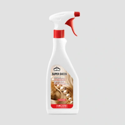 Nourishing and silky tangle free finish SHAMPOO SHEEN degreases, cleans and nourishes coats of all colours. The special formula with "sheen effect” makes the coat and horsehair soft, bright and shiny. Use together with SUPER SHEEN for maximum benefit. Directions for use: Wet the coat, apply the shampoo on several areas with a soft sponge, paying attention to the horse's eyes, massage and then rinse. For the tail, dilute Sheen Shampoo in a bucket with warm water, soak the tail for a few moments, then massage in and finally rinse thoroughly.