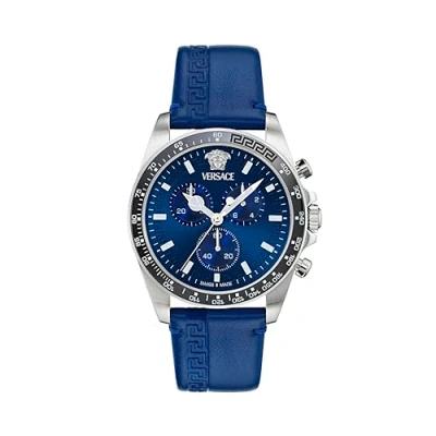 Here is the Greca Chrono Wave by Versace, a striking, masculine watch designed for the modern gentleman. This chronograph watch is equipped with stopwatch, luminous hands, luminous numbers, tachymeter and has a Swiss movement. High quality blue leather strap, 21 cm long and 22 mm wide, with a pin buckle. Case diameter: 43 mm, case height: 11.25 mm, case colour: silver, dial colour: blue Waterproof: 5 bars -Weight: 85g The watch comes in an original gift box and has a 2 year warranty
