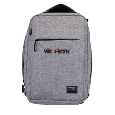 The Vic Firth Gray Travel Backpack is a unisex fashion backpack with functional details perfect for traveling drummers The backpack features include a fully expandable front compartment with a variety of pockets and adjustable compression strap, as well as a padded trolley sleeve on the back This backpack has a place for everything with a padded laptop and tablet pocket and a mesh side pocket for drumsticks The comfortable, adjustable padded back straps include a sunglasses hook with an embroidered Vic Firth flag logo The pack features an embroidered front Vic Firth logo with debossed leatherized VF flag patch