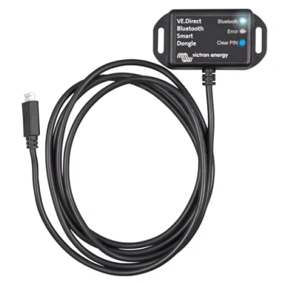 Using the Victron Energy VE.Direct to Bluetooth Smart dongle you can display your Victron Energy BMV or MPPT information on iOS and Android devices, using the VictronConnect app With the VE.Direct to Bluetooth Smart dongle you can get live status info, see historical values as well as configure Victron products The dongle works together with the VictronConnect App, available for both Android and iOS devices Easily view information wirelessly such as battery status and solar panel power, plus other useful data The dongle is able to read data from all products with a VE.Direct port, such as the BMV-70x series battery monitors, Phoenix Inverters with VE.Direct port, MPPT Solar Charge Controllers