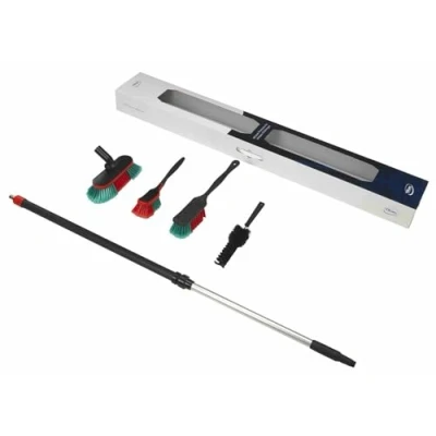 Vikan transport cleaning Kit, contains 5 cleaning tools Contains three handheld cleaning brushes for different areas of vehicle, including alloys, wheels and grills Contains telescopic waterfed handle and brush for cleaning large surfaces areas quickly and efficiently Handle extends to 1.6 metres for difficult to reach areas Variety of filament types depending on task