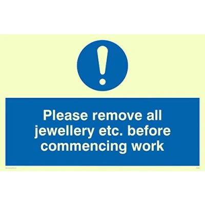 Viking Signs MH200 A4L PV "Please Remove All Jewellery Etc. Before Commencing Work" Sign, Photo luminescent Sticker, 200 mm H x 300 W