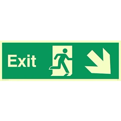 Fire exit/emergency exit sign with running man facing right & arrow diagonal down right Complies with EN 7010 Safety Sign Requirements Glow In The Dark sticker. Can be fixed onto any flat surface and will store ambient light and then glow if power is temporarily cut to lights or visibility is reduced Photo luminescent Sticker Viking Signs brand Safety Signs are manufactured in the UK and used everywhere from Giraffe Restaurants to the Excel Centre in London