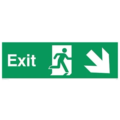 Fire exit/emergency exit sign with running man facing right & arrow diagonal down right Complies with EN 7010 Safety Sign Requirements Sticker with a white background colour, comes with a self-adhesive backing. Suitable for fixing to clean, flat, solid surfaces Vinyl Viking Signs brand Safety Signs are manufactured in the UK and used everywhere from Giraffe Restaurants to the Excel Centre in London
