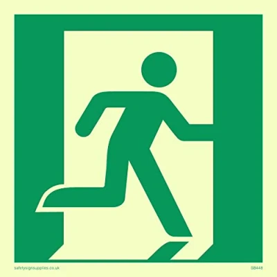 Fire exit/emergency exit sign with running man facing right Complies with EN 7010 Safety Sign Requirements Glow in the dark. Tough and flexible-suitable for indoor and outdoor applications, can be stuck with adhesive (not supplied) or easily drilled and fixed with screws Plastic Semi-rigid Photo luminescent Viking Signs brand Safety Signs are manufactured in the UK and used everywhere from Giraffe Restaurants to the Excel Centre in London