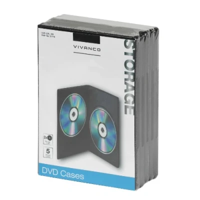 Five sturdy empty compartments for storing two DVDs, CDs, Blu-ray archiving a total of 10 data media. With transparent outer film for inserting the DVD cover Dimensions: 190 x 136 x 14 mm Zakres dostawy: Vivanco DVD podwójne etui czarne