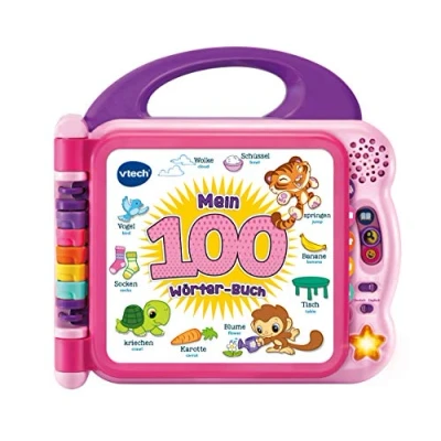 Fun educational toy: the electronic My 100 Words book playfully teaches children many new words from the areas of colours, vehicles, body, food, clothing, nature and much more Learning fun on 12 pages: when the child taps on the individual elements of a page, they learn creatively over 100 English and German words - with the voice switch the language can be set The luminous star button triggers 2 songs in English or German language and encourages the child to sing along - a children's book with music for cheerful language promotion Learn in a playful way: typing on the pictures and turning the pages promote hand-eye coordination and motor skills. With 3 game modes: words, fun facts and sounds Box contents: 1 x Vtech My 100-word book pink / picture dictionary with volume control, voice switch and automatic switch-off / German version / 2 x AA demo batteries / item no. 80-601554