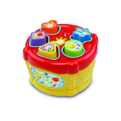Musical drum with light and voice to learn the shapes When playing the drum with your hands, different sounds are activated; adjustable sensitivity, less intensity, you have to play with less force Includes a shape sorter with 5 colored pieces to insert and learn shapes, numbers and animals The light flashes to the beat of the 3 songs and 20 tunes of the drum Lid can be lifted up and stored inside the drum The batteries are for demonstration purposes, we recommend the use of high-performance alkaline batteries specific for technological products, Manufacturer: Vtech