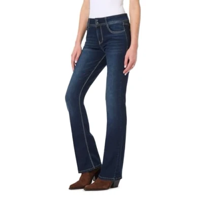 Mid-rise contour waistband prevents gapping so you can sit with us with this shape-sculpting fit. This jean hugs your curves Made with instastretch denim, our premium stretch denim offers outstanding recovery that hugs and sculpts all day Regular=32", Long=34", Short=30" inseam. 17.5" Leg opening - 9" Front rise. Measurements taken on size 5. Model is 5' 9" and wearing a size 5 5 pocket design featuring contrast-stitched button-flap back pockets Tight fit through the knee, faded legs, whiskered hips