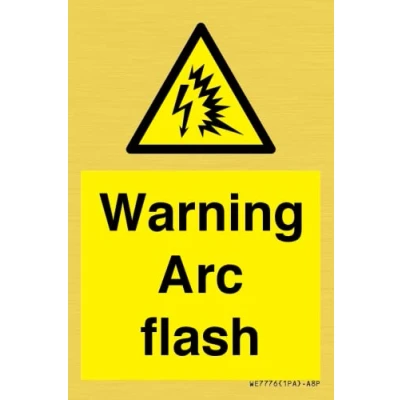 W042 : Arc flash This sign is made from vinyl gold sticker Gold metal effect sticker for flat, clean surfaces. Not for rough, plastic, or dusty surfaces. A8 portrait Sign Text: Warning Arc flash