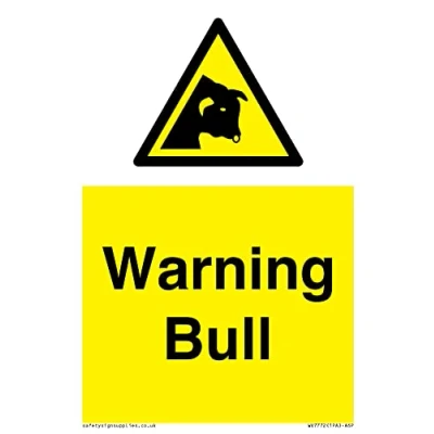W034 : Bull This sign is made from vinyl / sticker Air Release vinyl makes it easy to stick to flat, clean surfaces without bubbles. Not for rough, plastic or dusty surfaces. A6 portrait Sign Text: Warning bull
