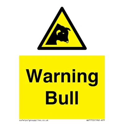 W034 : Bull This sign is made from vinyl / sticker Air Release vinyl makes it easy to stick to flat, clean surfaces without bubbles. Not for rough, plastic or dusty surfaces. A7 portrait Sign Text: Warning bull