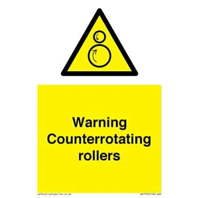W025 : Counterrotating rollers This sign is made from vinyl / sticker Air Release vinyl makes it easy to stick to flat, clean surfaces without bubbles. Not for rough, plastic or dusty surfaces. A6 portrait Sign Text: Warning Counterrotating rollers