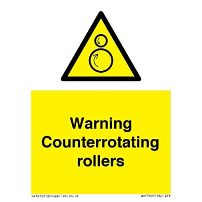 W025 : Counterrotating rollers This sign is made from vinyl / sticker Air Release vinyl makes it easy to stick to flat, clean surfaces without bubbles. Not for rough, plastic or dusty surfaces. A7 portrait Sign Text: Warning Counterrotating rollers