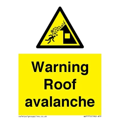W040 : Roof avalanche This sign is made from vinyl / sticker Air Release vinyl makes it easy to stick to flat, clean surfaces without bubbles. Not for rough, plastic or dusty surfaces. A7 portrait Sign Text: Warning Roof avalanche
