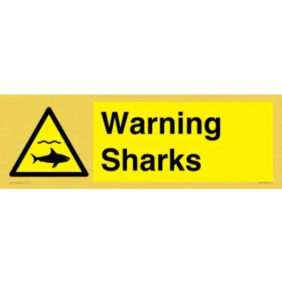 W054 : Sharks This sign is made from vinyl gold sticker Gold metal effect sticker for flat, clean surfaces. Not for rough, plastic, or dusty surfaces. 41 landscape Sign Text: Warning sharks