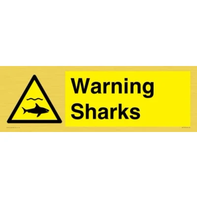 W054 : Sharks This sign is made from vinyl gold sticker Gold metal effect sticker for flat, clean surfaces. Not for rough, plastic, or dusty surfaces. 62 landscape Sign Text: Warning sharks