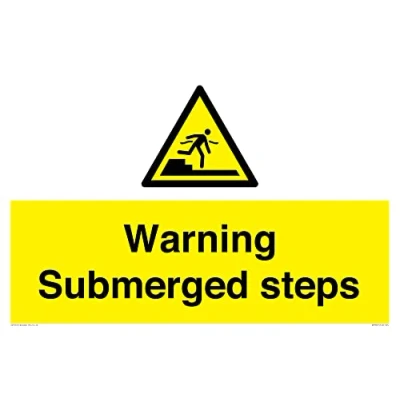 W512 : Submerged step or steps This sign is made from vinyl / sticker Air Release vinyl makes it easy to stick to flat, clean surfaces without bubbles. Not for rough, plastic or dusty surfaces. A2 landscape Sign Text: Warning Submerged steps