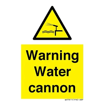W518 : Water cannon This sign is made from vinyl / sticker Air Release vinyl makes it easy to stick to flat, clean surfaces without bubbles. Not for rough, plastic or dusty surfaces. A8 portrait Sign Text: Warning Water cannon