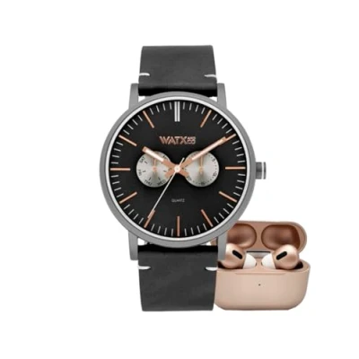Watx andco Unisex Analogue Watch Round black stainless steel dial with quartz movement With mineral glass Black leather strap Water resistant to 5 bar