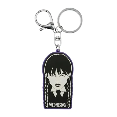 Soft PVC keychain Design features Wednesday's face Both front and back effect Metal ring and hook Dimensions: 0.5 x 4.9 x 6.8 cm