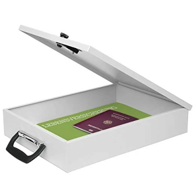 Document box in DIN A4 format With 3-digit combination lock and suitcase handle Made from powder-coated sheet steel, matte, hard-wearing surface Two drill holes for screw mounting Size: 35.5 x 26.0 x 6.7 cm, internal dimensions: 33.9 x 24.2 x 6.6 cm. Colour: light grey