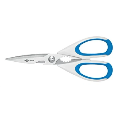 Wedo Vario All-Purpose Scissors, Length: 22 cm, Colour: White/Ice Blue Modern scissors with coloured, non-slip soft handles, also suitable for left-handed users Dishwasher safe, supplied with blade guard International products have separate terms, are sold from abroad and may differ from local products, including fit, age ratings, and language of product, labeling or instructions. Modern design scissors with coloured, non-slip soft grip handles Suitable for left-handers Brushed stainless steel precision ground blades Fitted with a bottle opener and a tightening aid for screw tops and corks