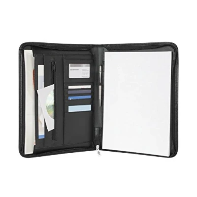 Wedo Elegance A4 Conference Folder with Writing Pad. Colour: black The extraordinary combination of high-quality faux leather and textured nylon gives this conference folder from the elegance bag series a modern and elegant look Versatile: A4 outer compartment, elastic pen loop, one A4 and A5 compartment, a zip pocket, a viewing window for business cards, four card slots and two additional slip pockets Dimensions: approx. 25.0 x 3.5 x 33.0 cm Packed in an attractive single box Deluxe companion for meetings, seminars and conferences Contains multiple compartments Supplied complete with A4 writing pad Made from easy to clean high quality soft leather look material