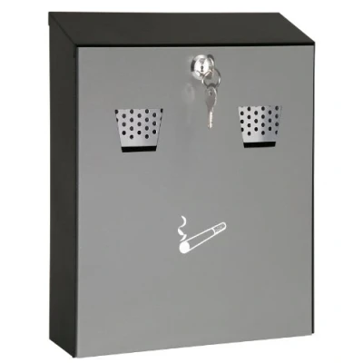Weather and scratch resistant Two openings with mesh metal plates to safely stub out cigarettes Lockable door gives easy access for emptying and cleaning the stainless steel inner container Complete with 2 keys and a wall mounting kit Solid steel construction with black and grey powder coated finish