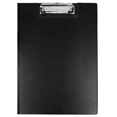 Clipboard folder made of sturdy cardboard with black plastic cover. Side hinged lid with inner pocket and pen holder. A4 size 32 x 23 cm black spring clip with plastic corners for secure hold. Ergonomic with rounded edges and light weight. Practical hanging loop for storage and as a display.