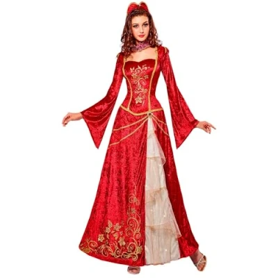 The elegant dress with trumpet sleeves is made from a red velvet fabric and is equipped with golden embellishments and borders The costume for adults is available in size M The costume is available for adults in size M, Manufacturer: Widmann