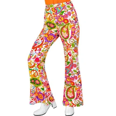 The white flared trousers are designed with colourful motifs such as peace signs, flowers, lettering and much more Whether at the hit move, carnival or a flower power theme party, with this outfit you will be the centre of attention at any event With a matching blouse, glasses and a headband (not included), you can perfectly complement the hippie look, Manufacturer: Widmann
