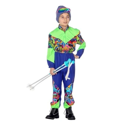 With this retro jumpsuit in size 164, your child will transform into a real skier in the style of the 80s It is closed at the front with a zip and has a stand-up collar This retro ski suit is made from a supple fabric in blue with bright green in combination with a colourful 80s print The elastic waistband of this snowsuit ensures a perfect fit The sleeves and trouser legs are equipped with comfortable elastic bands for a sporty effect, Manufacturer: Wilbers Karnaval B.V.