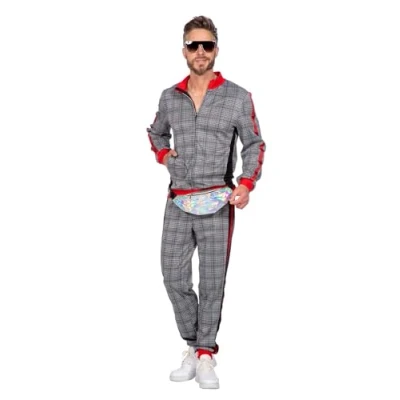 This tracksuit in size S consists of a jacket and matching trousers It is made from a comfortable jersey fabric with a grey checked designer pattern The jacket has an elastic waistband, red cuffs and a zip The trousers also have an elastic waistband Non-iron fabric, washable at 30 °C, Manufacturer: Wilbers Karnaval B.V.