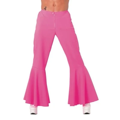Eye-catching retro style: flared hippie pants 70s style - perfect for carnival, theme parties or festivals Pink color: soft flowing material for a comfortable fit Size 50: Elastic waistband and comfortable fit - the trousers fit comfortably and fall from knee to wide leg Practical closure: easy to put on and take off thanks to the zip and button at the front Easy care and practical: washable at 30 °C and do not iron